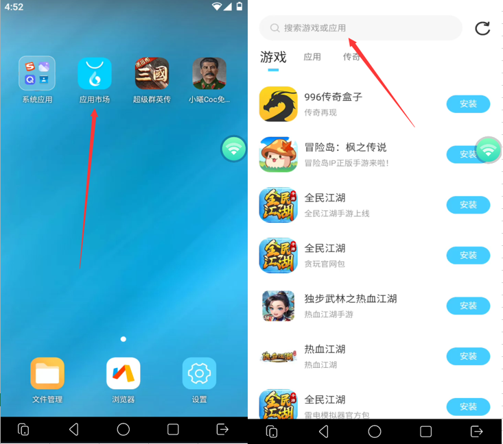 3.点击云桌面内的应用市场,可通过热门推荐,找到要托管手机游戏或应用,也可以通过搜索栏,迅速搜索定位应用(下面以《热血江湖》为例介绍小滴安卓版操作流程;