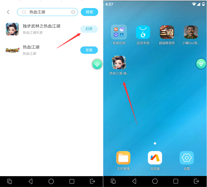 5.安装成功后,点击“打开”或在桌面点击热血江湖手游图标,打开并登录账号进入热血江湖游戏。