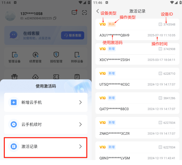 - 在激活记录里面可以查看操作过购买或者续费的设备ID,以及使用的激活码前4位数和后4位数。