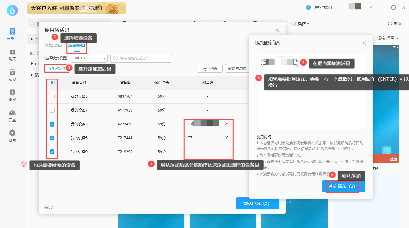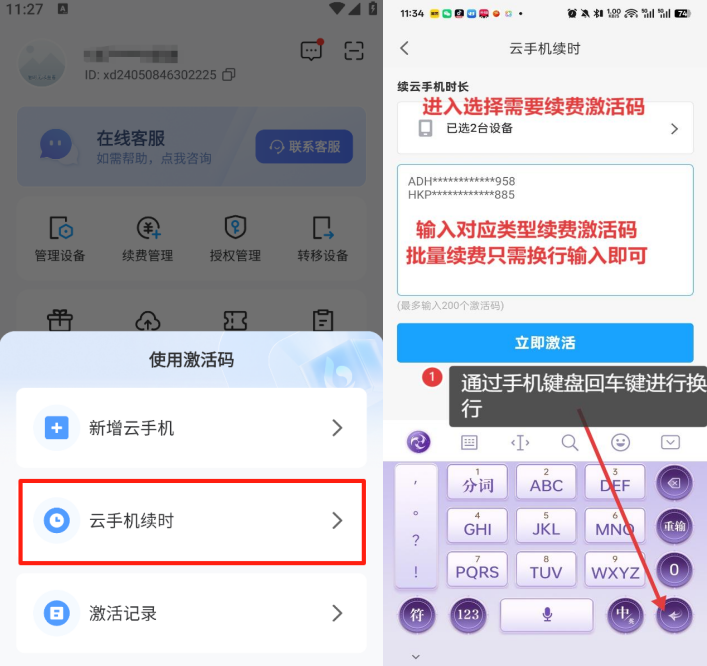 - 选择云手机续费,在选择设备处选择相同类型的多台设备后,确定回到激活码输入页面,换行输入激活码即可。