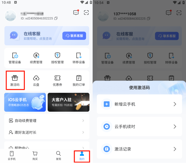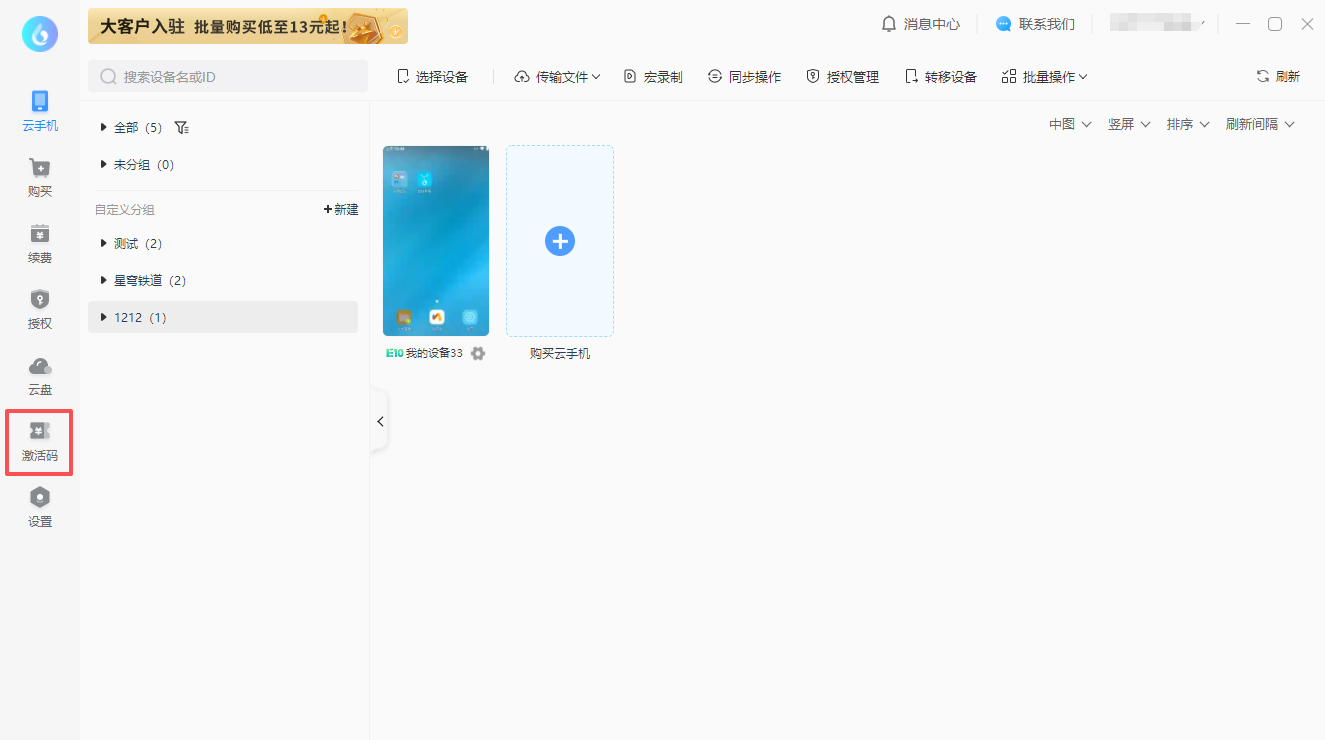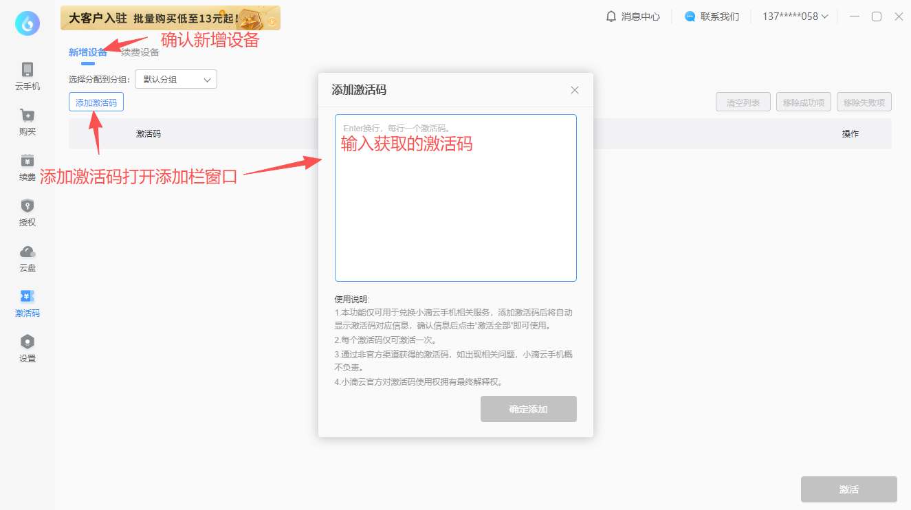 - 选择新增云手机,激活码页面输入激活码,点立即激活即可