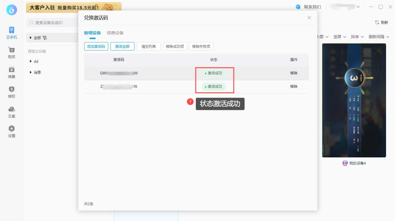 - 确认添加后,激活码就会依次显示在选择设备的后面,