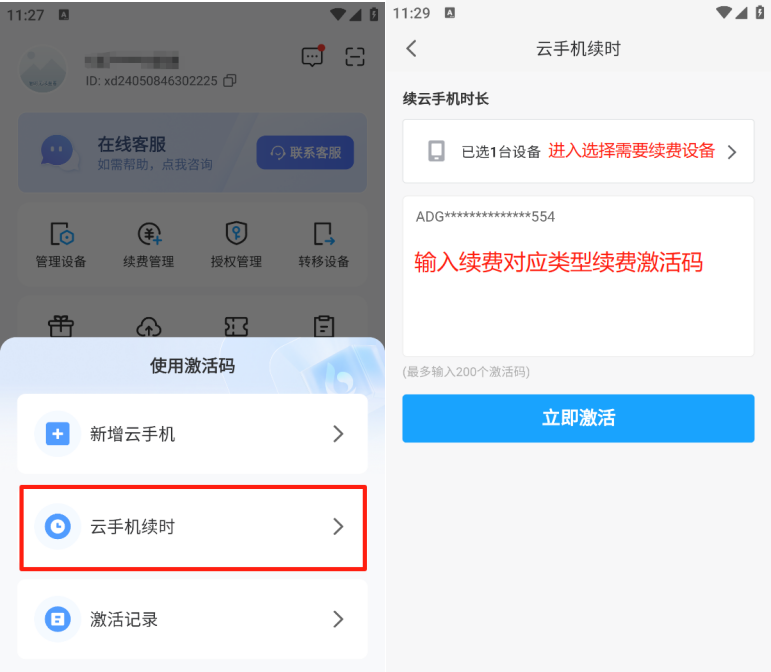 - 选择云手机续费,在续费激活页面选择需要续费的设备,再输入激活码,点击立即激活
