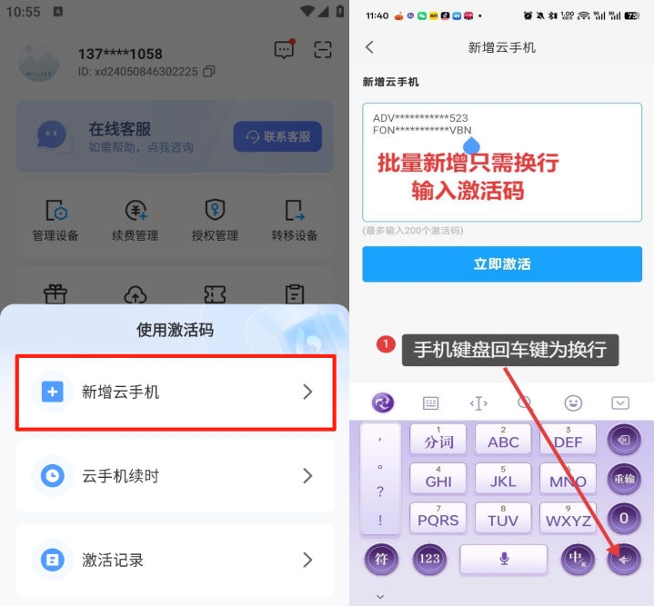 - 选择新增云手机进入后,如需要批量,只需在原有基础上,换行输入激活码即可.如下图所示