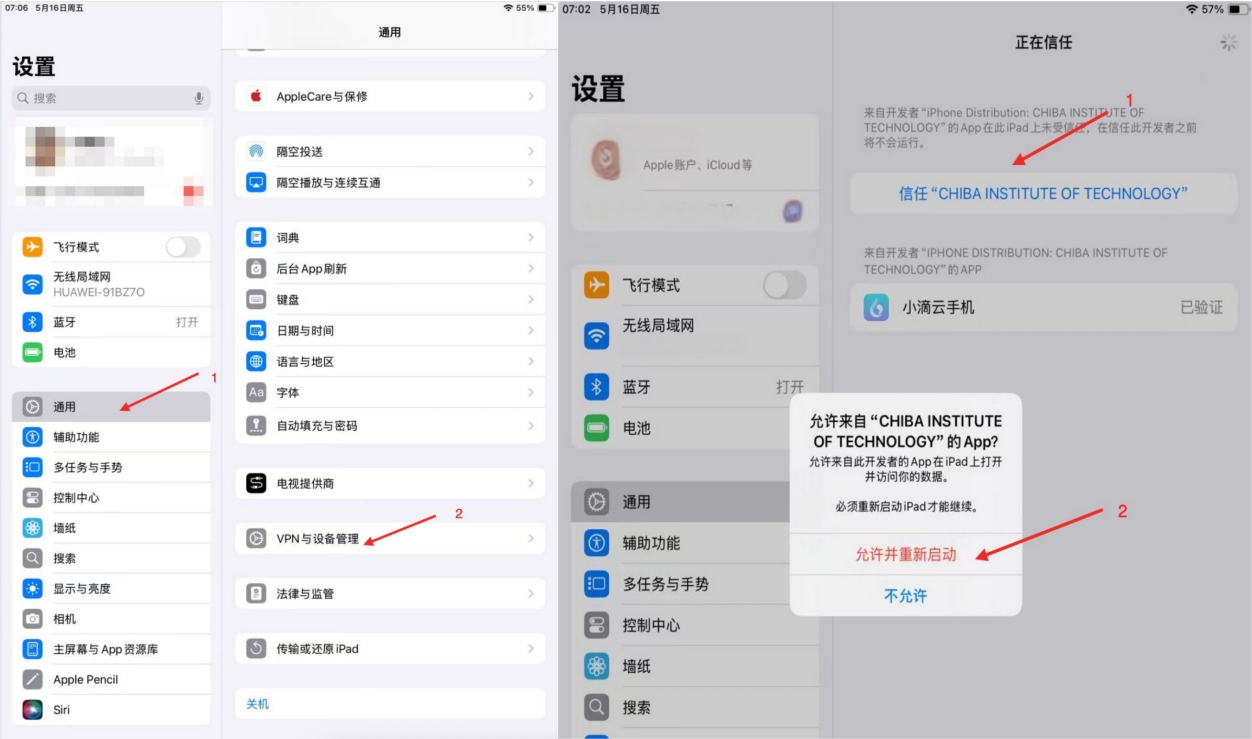 第三步:信任企业,手动打开“iPad设置”找到“通用”进入找到“VPN与设备管理”,再对小滴云客户端进行信任,信任完成后,就下载完成。