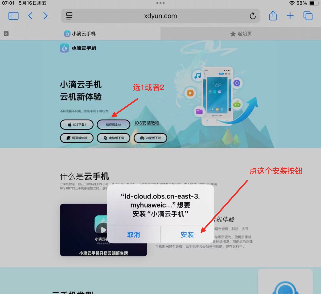 第二步:开始下载:跳转为移动网站后,可以看到两个下载选择(注:如果iOS下载1无法使用掉签,就选择iOS下载2)选择下载后,再选择弹出提示安装。