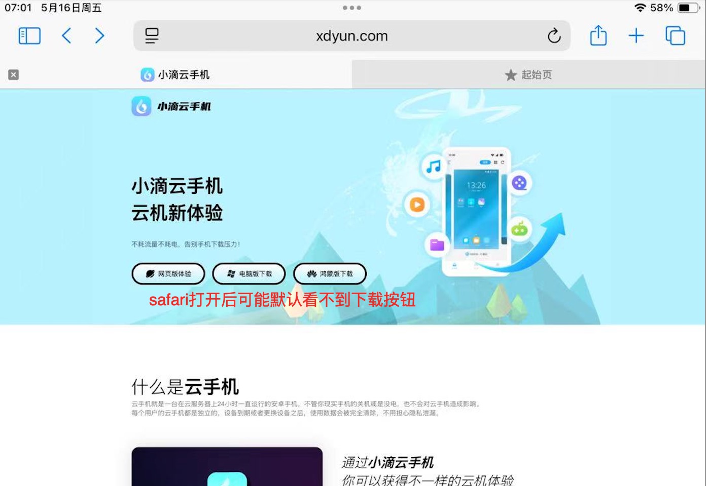 第一步:复制小滴云官网到Safari浏览器打开(注:打开后可能会默认不显示不显示下载按钮选择,此时就需要转到移动网站)